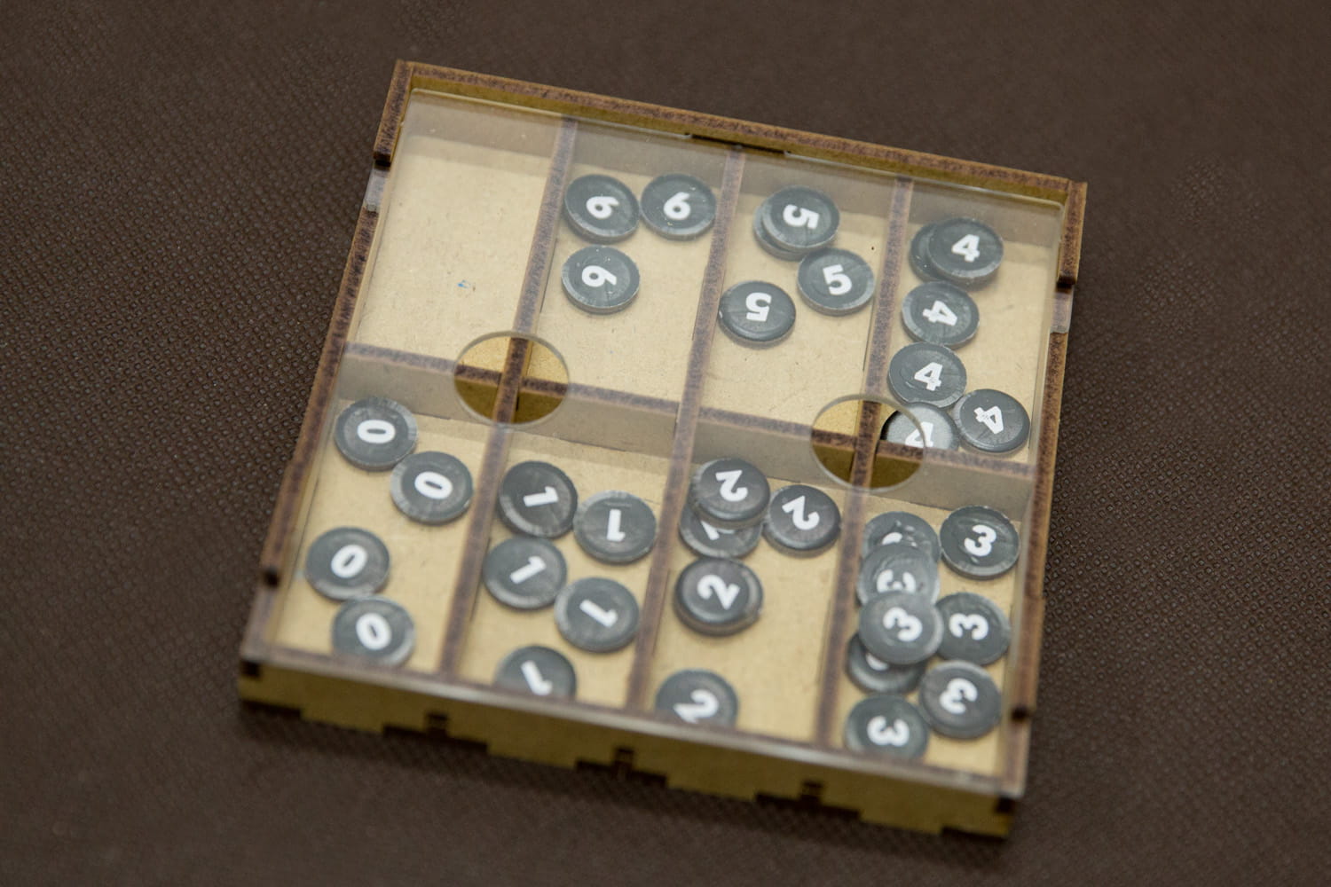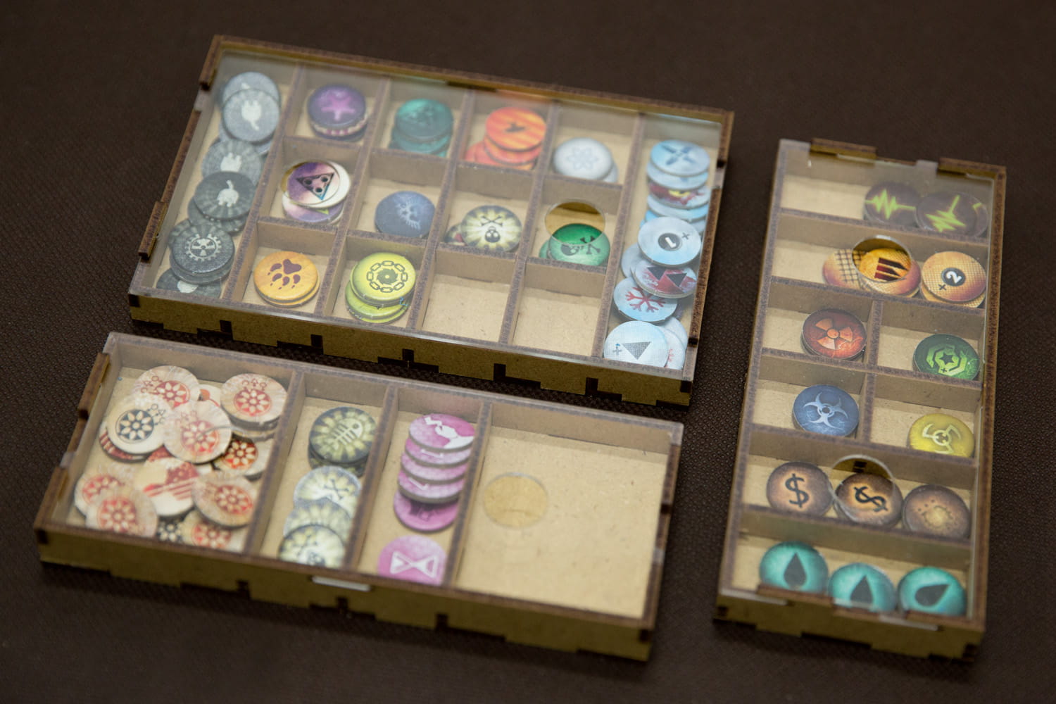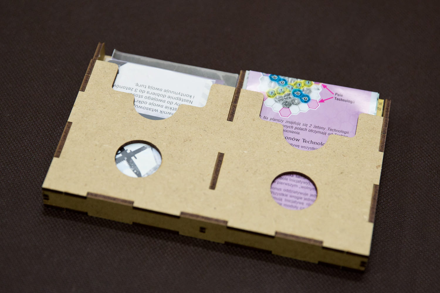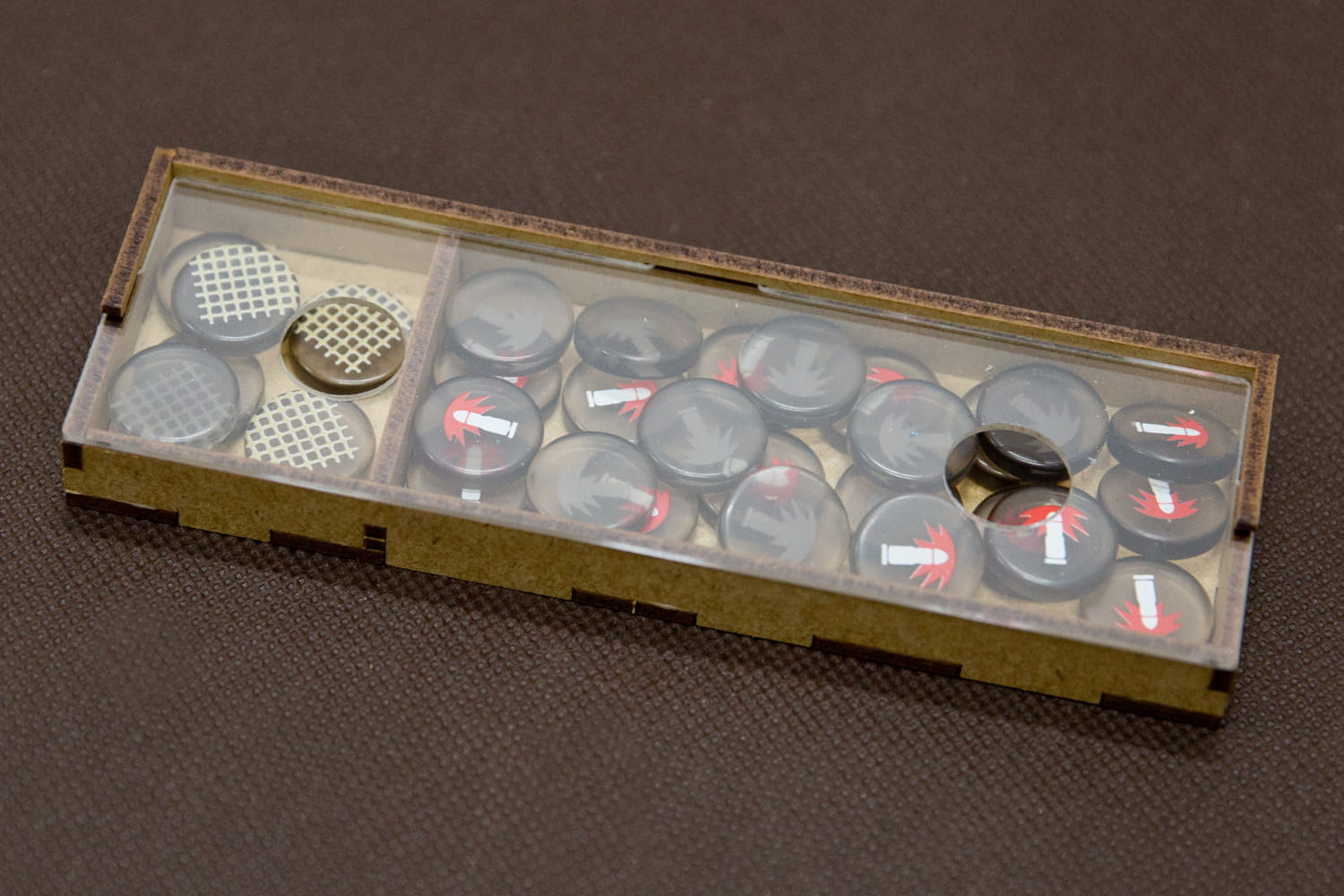 - 3 pojemniki zasuwane pleksą na żetony i znaczniki sztabów,